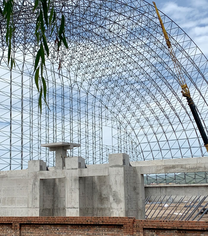 (4)本工程網架采用“山墻起步+錐體高空散裝法”進行安裝,即先安裝1軸山墻網架(含相鄰跨網架)作為整個網架的起步網架,然后從起步網架開始依次往17軸方向對網架進行高空散裝,***后安裝17軸山墻網架,***終安裝完成整個網架。